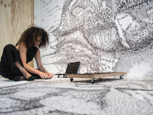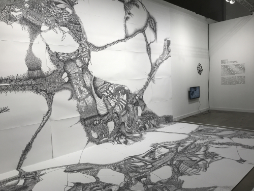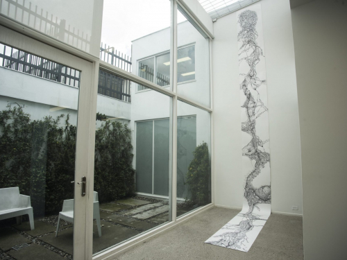 Utilizar el cuerpo como canal, en este caso, ha generado procesos de larga duración de una calidad meditativa que son, además, muy exigentes a nivel físico. Inevitablemente, en su trabajo se establecen puntos de contacto con la intimidad femenina a raíz de su conexión con el cuerpo. Estos puntos de contacto no se dan desde un marco teórico feminista, sino en el reconocimiento de los sistemas de vida que intersectan el ser mujer- sus objetos personales, sus rutinas, la red de afectos que tiene con sus hijas, sus amigas, su mamá. Este trabajo con los ecosistemas de la feminidad ha derivado también en la creación de organismos de ficción, algunos seres ya muertos cobran una segunda vida a través del dibujo; otras criaturas inquietantes, tal vez monstruosas, nacen con la recuperación y conjunción de residuos varios.